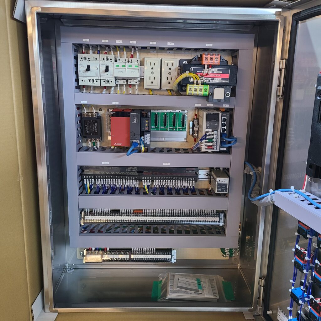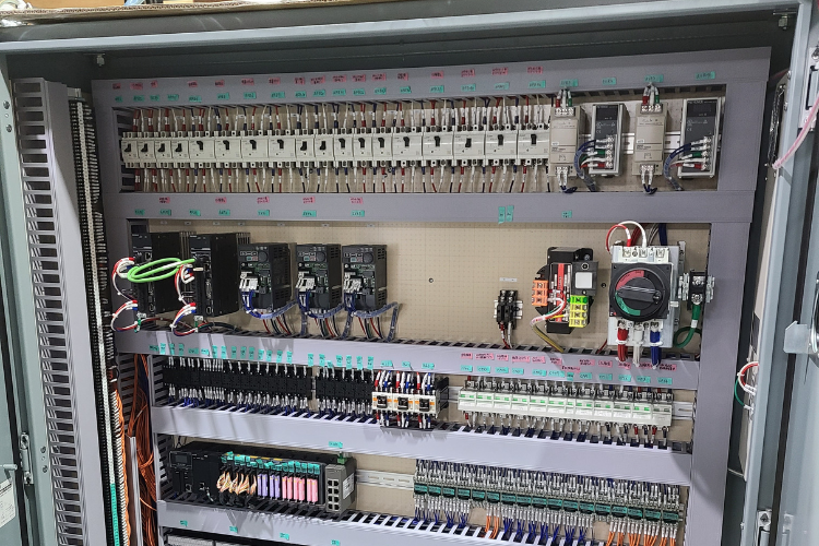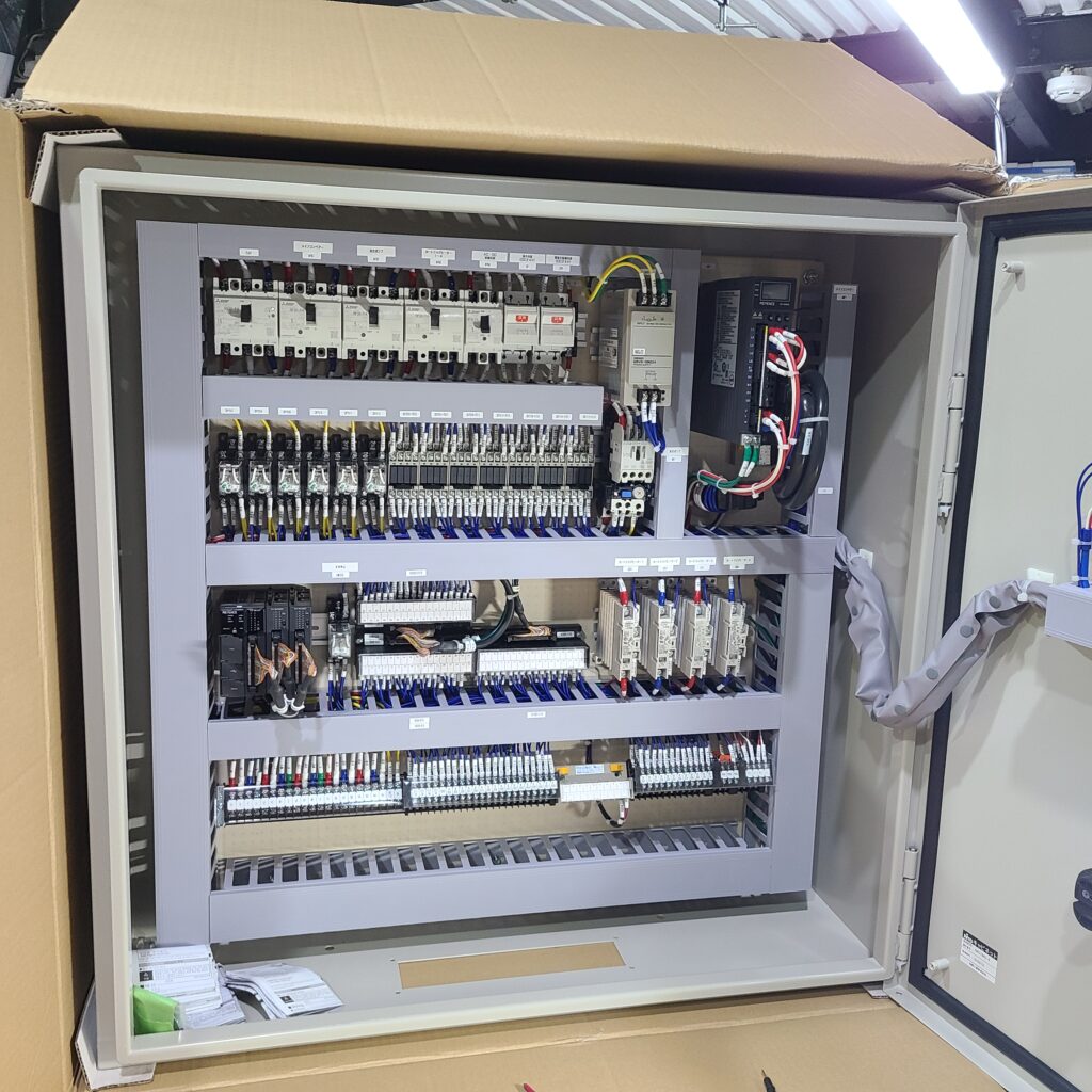 お客様の自動化設備用にサーボ6軸制御盤を製作。制御機器の選定から盤内レイアウト、配線作業まで丁寧に実施しました。各軸の協調制御に必要な機器を確実に接続し、試運転で動作確認済みの高品質な制御盤に仕上げました。